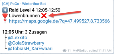Raids an Arenen, welche EX-Raid-fähig sind, werden zusätzlich in unserem Raid Bot Channel auf Telegram mit einem „X“ Emoji markiert.