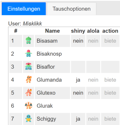 Im Tab Tauschoptionen werden Euch dann alle Leute angezeigt, die entweder Pokémon suchen, die Ihr bietet oder umgekehrt. Hier kommt der vorhin gesetzte Telegram-Benutzername ins Spiel:
