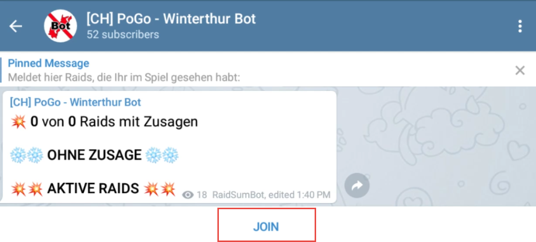 Trete als erstes folgendem Kanal bei und klicke unten auf „Beitreten“: https://t.me/pogoRaidsWinterthur