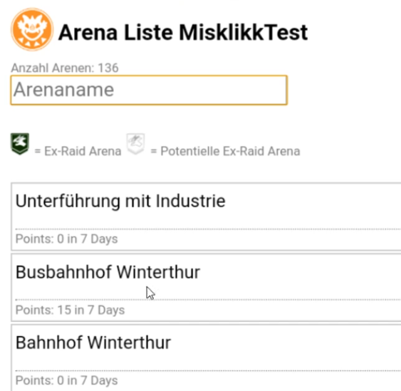 EX Raid Arenen werden durch ein X Emoji neben dem Arenennamen angegeben: