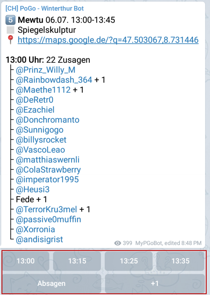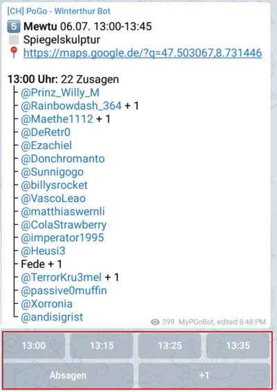 Im Falle, dass Du kurzfristig verhindert bist, resp. wenn Du siehst, dass der Raid ohne Deine Teilnahme unter Umständen nicht durchgeführt werden kann, melde Dich einfach in der Hauptgruppe oder klicke auf den Telegram-Benutzernamen einer teilnehmenden Person (blau markiert im oberen Screenshot).